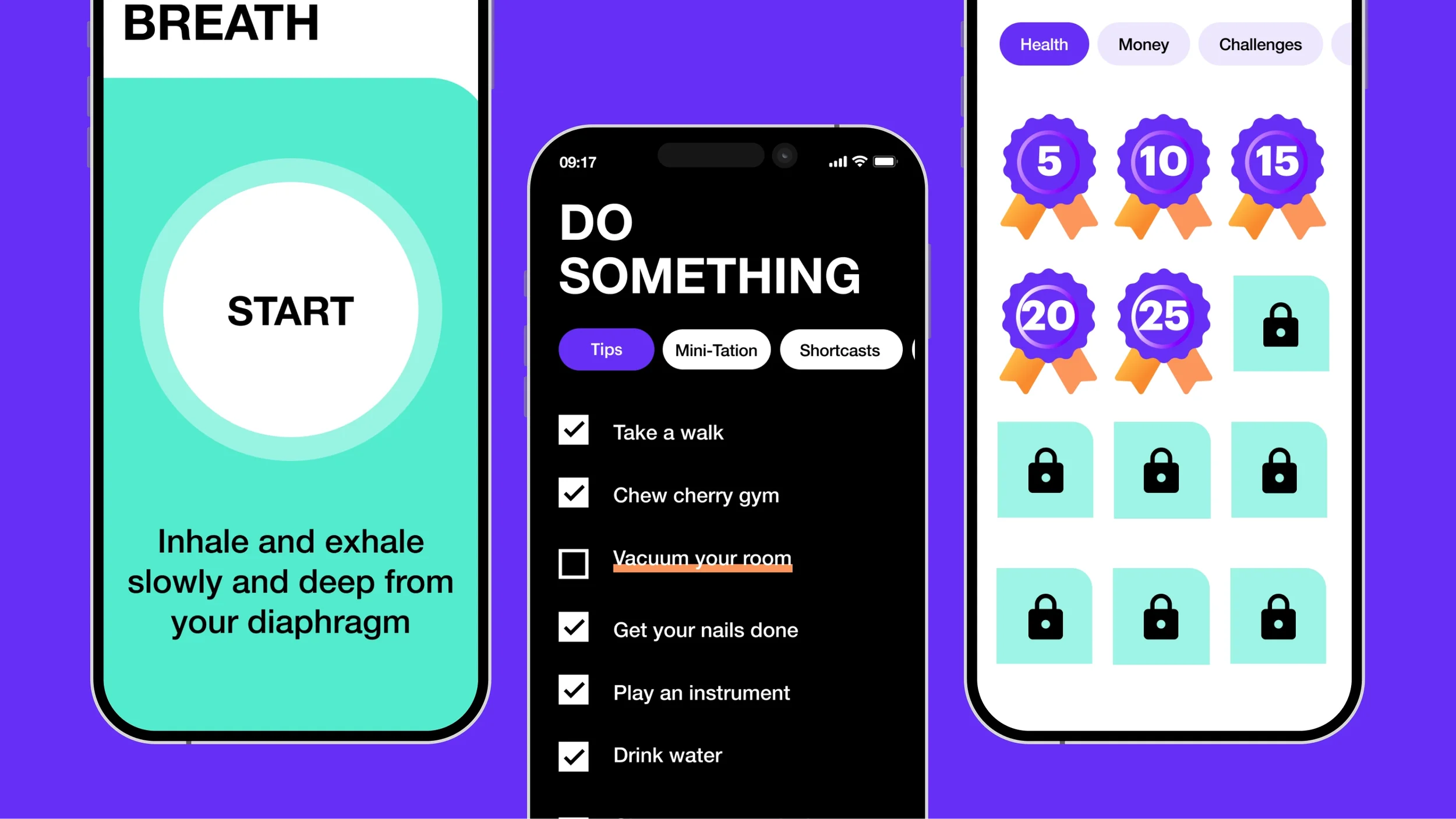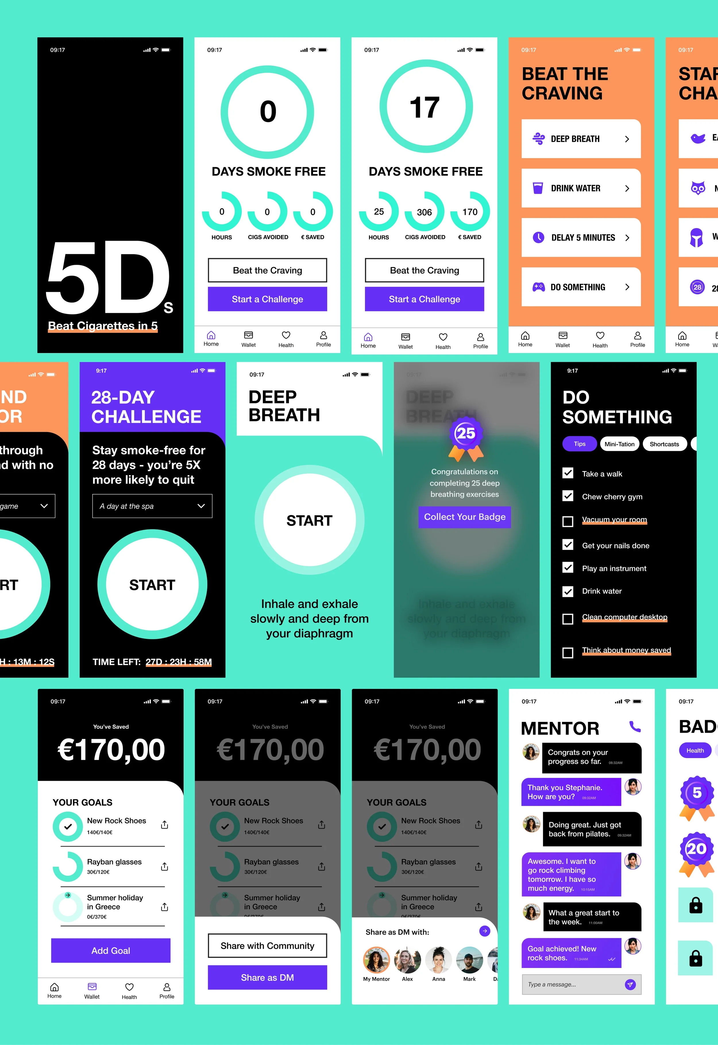I designed a mobile app that helps users quit smoking through gamification and immediate craving-management tactics tailored for ADHD. Key features include built-in challenges, progress tracking, and the ability to connect with a mentor for accountability.